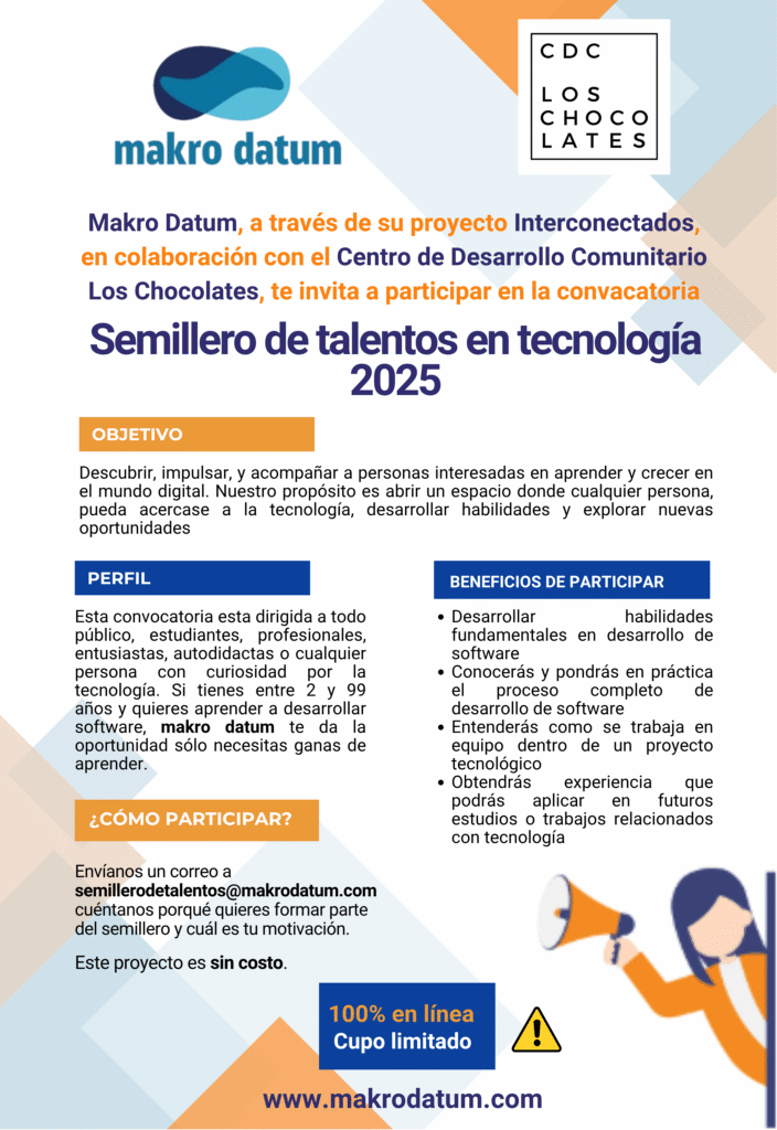 Prepárate para crear, innovar y brillar en el Semillero de Talentos en Tecnología 2025. Envíanos un mensaje a: semillerodetalentos@makrodatum.com
